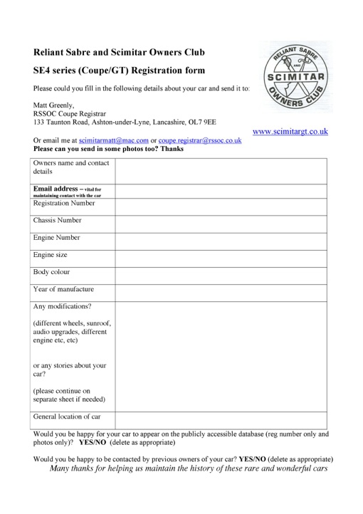 If you own, or know of a Scimitar GT, please let me have the details of it by downloading the form below, filling it in and sending it back to me (along with some photos too please, even if the car is part buried under a tree). Even if you think that your car is already know to the club, please can I ask that you re-register it as I’m updating old records as well as creating new ones for previously unknown cars.